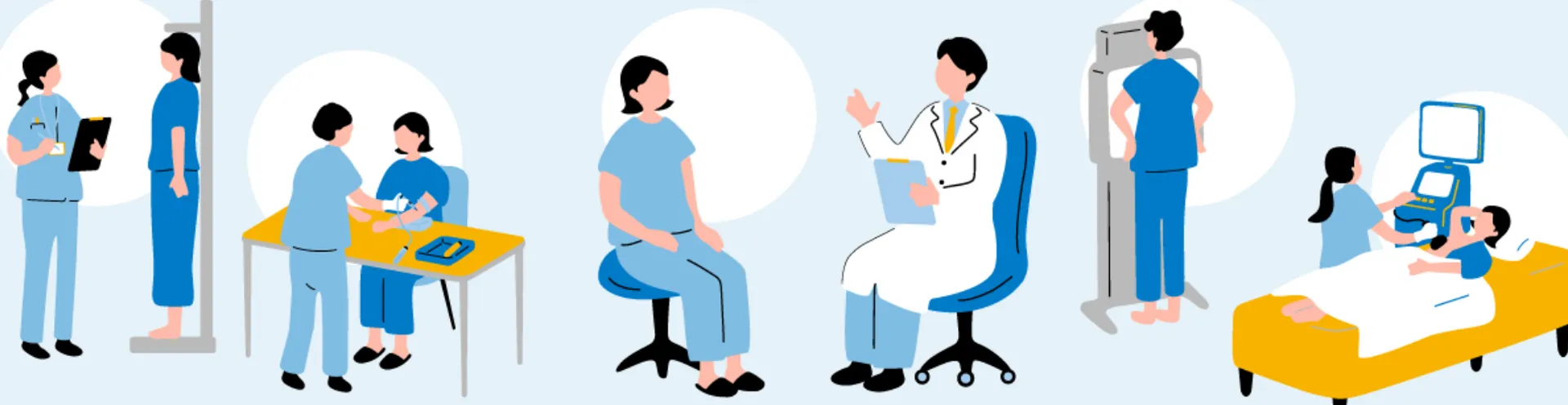 診察、尿・血液の検査、胸部レントゲン検査など全般的な検査を行います。ご要望に応じて付加検診も可能。